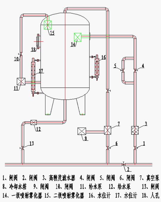 增壓噴出,形成霧化裙,粗除氧的水在同等真空下,又將溫度提高一層,經(jīng)二級(jí)除氧的水落在真空缸下部,當(dāng)水位計(jì)克度達(dá)到400mm時(shí),啟動(dòng)鍋爐給水泵將二次除氧的水抽出經(jīng)流量計(jì)送給鍋爐。