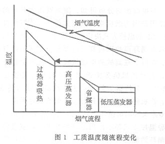 point),表示高壓蒸發(fā)器出口煙溫與汽包飽和溫度之間的傳熱溫差,工況變動(dòng)時(shí)該傳熱溫差基本不變,當(dāng)燃機(jī)排氣溫度變化時(shí)燃?xì)鉁囟染撓D點(diǎn)轉(zhuǎn)動(dòng)。排氣溫度降低時(shí)(圖中虛線所示),線越平坦,過(guò)熱器吸熱減少,省煤器及低壓蒸發(fā)器吸增加,排煙溫度升高,燃機(jī)排氣熱量利用程度低,反之亦然。運(yùn)行經(jīng)驗(yàn)表明,當(dāng)燃機(jī)排氣溫度在426.7℃(800°F)以上時(shí)低壓蒸發(fā)器的吸熱能保證除氧器壓力在設(shè)計(jì)范圍內(nèi)。