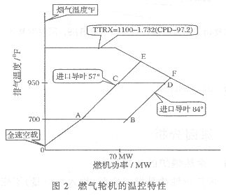 圖2是根據(jù)燃機(jī)實(shí)際運(yùn)行數(shù)據(jù)繪出的溫控特性,環(huán)境溫度23.9℃(75°F)。圖中O點(diǎn)為全速空載點(diǎn),TTRX為燃機(jī)允許的最高排氣溫度(溫控線),OABDF線表示單循環(huán)溫控方式下排氣溫度的變化規(guī)律。OACEF線表示在投入聯(lián)合循環(huán)溫控方式下排氣溫度的變化規(guī)律。OACE線表示當(dāng)時(shí)進(jìn)口導(dǎo)葉在57°,BDF線表示當(dāng)時(shí)的進(jìn)口導(dǎo)葉在84°。