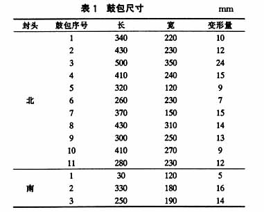 對北封頭,拆除保溫層進行了檢查,面積較大且突出量較大的有11處;對南封頭3個明顯的鼓包進行了測量,具體尺寸見表1。