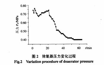 除氧器壓力的變化趨勢見圖2。從圖2看到,除氧器壓力在開始1min向下變化,從0.74MPa降為0.70MPa,變化速率0.04MPa/min,之后略有回升至0.76MPa,然后繼續(xù)下降,在前21min有兩個(gè)反復(fù),變化幅值均較小。21min之后開始出現(xiàn)明顯下降趨勢,53min后穩(wěn)定在0.40MPa水平,還未達(dá)到輔助汽源投入的壓力設(shè)定值0.245MPa。