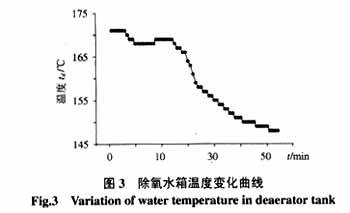 除氧水箱水溫的變化趨勢見圖3,從圖3可見,除氧水箱水溫度的變化趨勢則平緩得多,6min之前均維持171℃不變,之后緩慢下降,有兩段維持不變的過程。與壓力的變化趨勢相對(duì)應(yīng),25min后開始出現(xiàn)明顯下降趨勢,最后維持在148℃