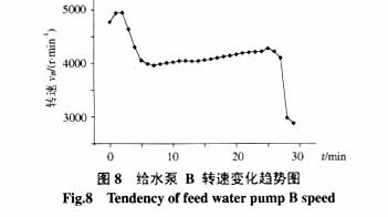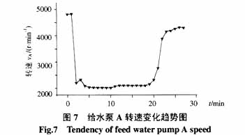 6,從中看到,在前3min,迅速降低,從穩(wěn)定時(shí)的689t/h降為258t/h,之后在較小的值穩(wěn)定運(yùn)行,給水流量Qw由于兩臺(tái)給水泵的運(yùn)行方式不同而異,A給水泵的轉(zhuǎn)速迅速由穩(wěn)定運(yùn)行的4808r/min,降為2204r/min,于是再循環(huán)門開啟,不再向給水母管供水;B給水泵的轉(zhuǎn)速由穩(wěn)定運(yùn)行的4776r/min,降為4056r/min,維持給水流量在268t/h左右(參見圖7、圖8)。