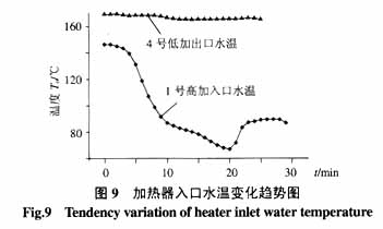 (2)另一個(gè)很重要的參數(shù)就是進(jìn)入除氧器的凝結(jié)水焓ic,各國在處理凝結(jié)水焓ic時(shí)略有不同。早期的計(jì)算公式以熱井水溫作為計(jì)算依據(jù),結(jié)果偏于保守,給水泵汽化最危險(xiǎn)時(shí)刻tmax出現(xiàn)的時(shí)間亦偏前。G.S.Liao認(rèn)為以低加出口溫度逐漸降低為熱井水溫,作為整個(gè)暫態(tài)過程進(jìn)入除氧器的凝結(jié)水溫來推導(dǎo),更為合理。溫降規(guī)律的假設(shè)有定溫、直線、折線等,我國學(xué)者提出凝結(jié)水焓ic分段線性降落規(guī)律[1,3]與實(shí)踐較為接近。但各種假設(shè)均比實(shí)測的溫度降落快,致使計(jì)算的除氧器給水焓降下降比實(shí)測值快[4~6]。4號(hào)低加出口凝結(jié)水溫的暫態(tài)過程如圖9,從圖中看到,在負(fù)荷變動(dòng)的前2min,溫降很小,從146.3℃降為145.0℃,僅下降1.3℃,溫降率為0.65℃/min。之后快速下降,再經(jīng)7min的時(shí)間從145.0℃降為91.6℃,下降53.4℃,溫降率7.63℃/min,然后溫降速度趨于平緩。