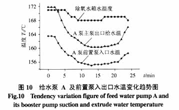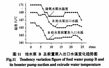 給水泵入口水溫見圖10、圖11,從圖中看到,A、B泵前置泵入口水溫在前2min基本保持不變,之后以一定斜率下降。A泵入口從163.3℃經(jīng)11min降為155.0℃,下降速率0.75℃/min;B泵入口從166.3℃經(jīng)6min降為162.0℃,下降速率0.72℃/min,然后基本保持不變。兩者的水溫均低于除氧水箱水溫,并未出現(xiàn)水溫滯后下降的現(xiàn)象。而除氧水箱溫度在開始的5min之內(nèi)保持171.0℃不變,從第6min才開始下降,經(jīng)4min后降為168.0℃,它的變化速率小于前置泵入口的給水。