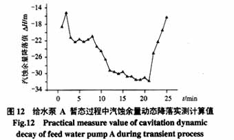=max[(ps-pd)v],其中ps為前置泵入口水溫對(duì)應(yīng)的飽和壓力,v為給水比容的平均值。利用式(3)計(jì)算瞬時(shí)熱焓is、id,反算出ps、pd,其計(jì)算涉及在DHmax時(shí)累計(jì)進(jìn)入除氧器的凝結(jié)水量xmax。得出的結(jié)論是汽化最危險(xiǎn)時(shí)刻出現(xiàn)在凝結(jié)水管系第一次換水完畢之后,凝結(jié)水管系加上下降管第一次換水完畢總時(shí)間以前的某時(shí)刻內(nèi),汽化點(diǎn)處在下降管的區(qū)段。從上面的分析來看,該計(jì)算偏于保守。暫態(tài)過程中汽蝕余量動(dòng)態(tài)降落實(shí)測計(jì)算值見圖12。從中看到,在負(fù)荷變動(dòng)的前1min,有增大的趨勢,從-18.61m變?yōu)?span lang="EN-US">-15.23m,之后逐漸下降,但整個(gè)過程(ps-pd)v均小于0,它表明DHa始終大于DHr,暫態(tài)過程不會(huì)發(fā)生汽化。
