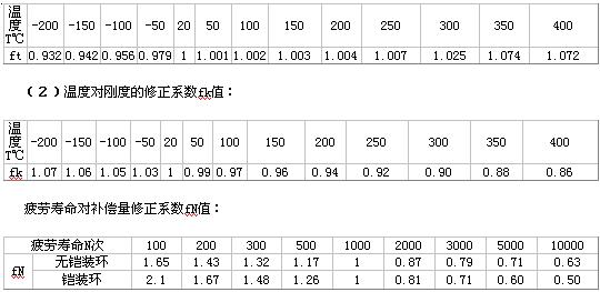 樣本中所列各種參數(shù),其設計條件是:溫度t=20℃,許用疲勞幫助[N]=1000次(外壓型[N]=100次。當實際工作溫度T≠20℃,疲勞壽命N≠1000次時,須用溫度對補償量的修正參數(shù)ft、溫度對剛度的修正系數(shù)fk、疲勞壽命對補償量修正系數(shù)fN進行修正。即用樣本中的額定值乘上修正系數(shù)。