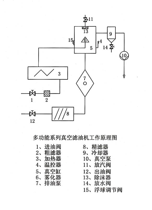 一、 概述 多功能真空濾油機(jī)主要用于電廠、電站、變電站、電器制造廠、造紙廠、電化廠、工礦企業(yè)的油品過濾。適用于過濾:透平油、絕緣油、冷凍油及30號以下的機(jī)械油中的水份、氣體和雜質(zhì)。 多功能系列真空濾油機(jī),我們積國內(nèi)外先進(jìn)經(jīng)驗(yàn),采用自己研制的先進(jìn)的油水霧化器和風(fēng)冷卻專利技術(shù)、升級加熱器、有先進(jìn)的脫水、脫氣裝置和高效除酸再生裝置及精密過濾器和粗濾器、溫度控制器等組成的一體化油處理先進(jìn)設(shè)備。具有脫氣脫水、除機(jī)械雜質(zhì)、膠體顆粒、酸性物質(zhì)等功能。主要適用于透平油、變壓器油和30﹟以下的機(jī)械油凈化和再生。為了滿足用戶的使用方便,本設(shè)備正常是單獨(dú)使用,利用真空脫氣、脫水裝置及粗精過濾器對油處理凈化。如果使用廠家的油品乳化,我們可根據(jù)廠家要求,根據(jù)不同情況增配不同的再生裝置共同使用。 為了提高真空濾油機(jī)的性能和可靠性,我們采用了自己研制的升級加熱系統(tǒng),高效油水霧化系統(tǒng)、風(fēng)冷卻系統(tǒng),既可以除去大量的水份和不同的雜質(zhì),又可以延長機(jī)械使用壽命。溫度采用自動化電路控制。排油泵采用浮球自動化控制系統(tǒng)。結(jié)構(gòu)緊湊、操作方便、體積小、實(shí)用性強(qiáng)、經(jīng)濟(jì)效果明顯、節(jié)能深受用戶好評。 二、 結(jié)構(gòu)及工作原理 多功能系列真空濾油機(jī)主要由粗濾器、加熱器、真空缸、霧化器、真空泵、排油泵、冷卻器、溫度控制器、破沫器,精密過濾器和電器控制等部件組成。由于使用廠家的條件和要求不同,真空濾油機(jī)還可增配除酸脫色吸附裝置一體化運(yùn)行。 開動真空泵系統(tǒng),真空表的負(fù)壓達(dá)到-0、06Mpa時(shí)可以打開進(jìn)油閥(1),待凈化油液從主油箱進(jìn)入粗濾器(2),經(jīng)過粗濾器除去油中的較大水顆粒和雜質(zhì)。粗凈化的油進(jìn)入加熱器(3),加熱后的油液進(jìn)入真空缸(5),再通過霧化器(6),在一定的溫度和真空條件下、油水充分霧化、水份蒸發(fā)向上、油液降下、油中所含的水份和氣體霧化后被真空泵抽出。進(jìn)入冷卻器(9),通過冷卻的蒸汽,部分被冷卻成水,部分未冷卻成水,但降溫后被真空泵(10)抽出,從排氣口排出。時(shí)刻要觀察真空缸的油位,當(dāng)油位達(dá)到觀察孔中心時(shí),可以將排油的主令開關(guān)旋至自動上即可,當(dāng)真空缸油達(dá)到高油位時(shí),排油泵自動排油,當(dāng)油位達(dá)到低油位時(shí)自動停泵�?扛∮驼{(diào)節(jié)閥(15)控制排油泵,排油泵將油液從真空缸打入精濾器(8)除去微粒雜質(zhì)后排入主油箱,排油時(shí)必須提前打開排油閥(12)。 三、 規(guī)格性能 (一) 系列多功能真空濾油機(jī)的型號和技術(shù)參數(shù)表[見表]