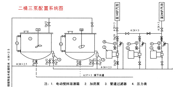 本裝置適用于火力發(fā)電廠300MW及以下機組氣包內加磷酸鹽處理,為二臺爐用一套設備,共設三臺加藥泵,其中一臺為備用,為單元制運動。